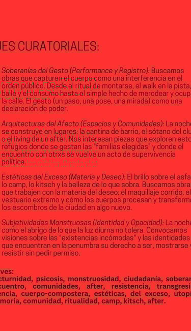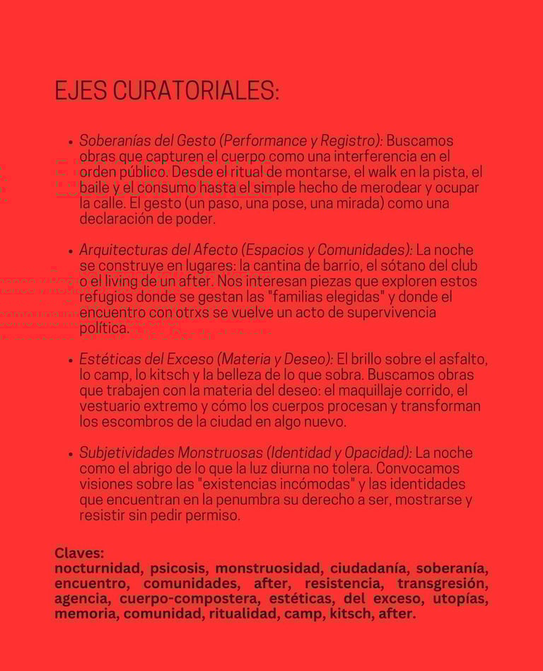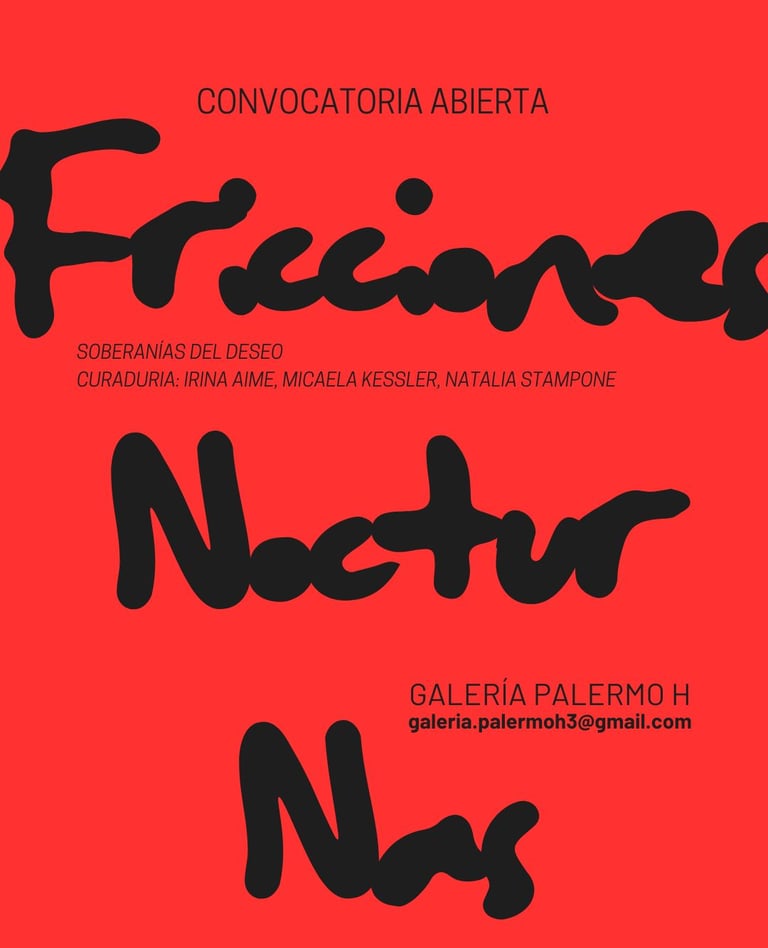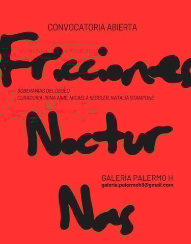 En el marco de la convocatoria “Fricciones Nocturnas: soberanías del deseo”, desde la Galería Palermo H invitamos a artistas multidisciplinarios a presentar obras que exploren la nocturnidad no como un vacío, sino como un territorio liminal y vibrante de disputa y goce. Buscamos piezas que dialoguen con la performatividad identitaria, la construcción de comunidades efímeras y la figura del 'monstruo' o la otredad que encuentra en la penumbra su derecho a existir.